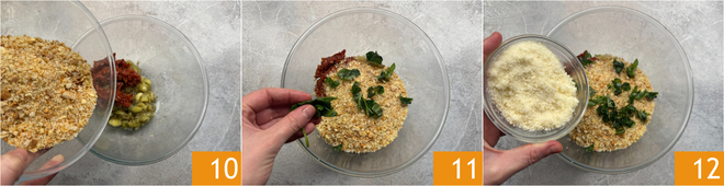 Also add the coarse breadcrumbs (preferably homemade) 10, basil torn by hand 11 and the grated cheese 12.