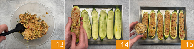 Mix the filling thoroughly 13. At this point place the hollowed zucchinis on an oiled baking tray and generously fill them with the filling, pressing it well with your hands 14. Sprinkle the surface of the stuffed zucchinis with a little more breadcrumbs 15 and drizzle with a little oil.