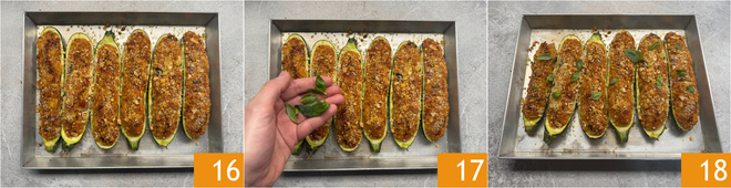 Bake in a preheated conventional oven at 392°F for about 30 minutes 16. After this time, remove from the oven and garnish with a few fresh basil leaves 17. Your vegetarian stuffed zucchini are ready to be served 18!