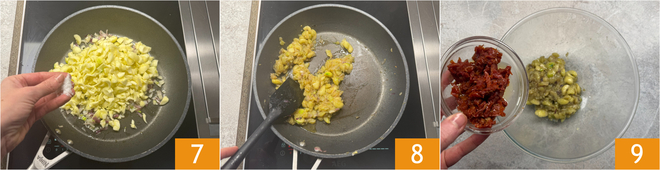 Salt 7 and continue cooking for 10–12 minutes, stirring often 8. Once cooked, transfer the flesh to a bowl together with the sun-dried tomatoes in oil that you have previously chopped 9.
