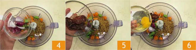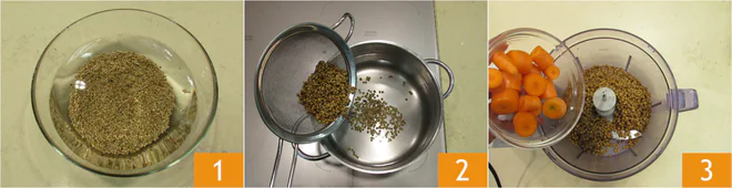 To prepare the veggie burger, rinse the lentils well 1, then drain them and boil them for about 30 minutes from when the water starts to boil, in lightly salted water 2. You can refer to the package for cooking times. Once ready, drain them well and transfer them to the mixer bowl. Add the carrot, trimmed, peeled, and cut into pieces 3.