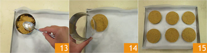 With the help of a 4-inch round cutter, form 6 burgers (about 2 tablespoons of mixture will be enough for each mold). Press the mixture well with the back of the spoon to compact the burger 13. Remove the ring 14 and continue this way until you have 6 burgers 15.