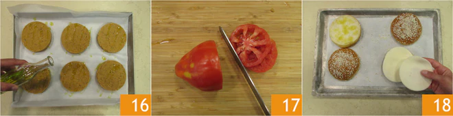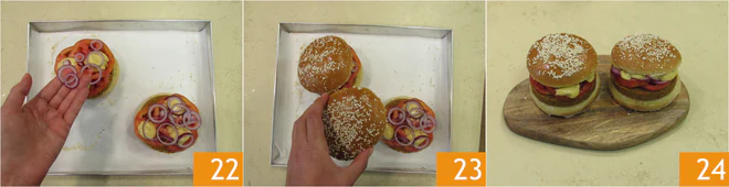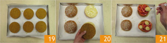 Remove the burgers from the oven 19 and assemble the sandwich: place the burger on top of the cheese 20, cover with a tomato slice and garnish with mustard 21.