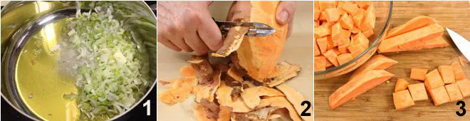 To prepare the sweet potato soup, clean the spring onions and slice them thinly, then let them soften over very low heat with the oil and butter for at least 15 minutes in a saucepan 1. In the meantime, peel the potatoes 2 and cut them into not too large cubes 3.