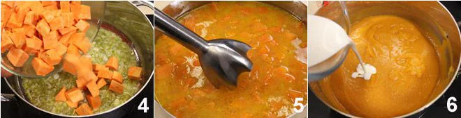 When the spring onions have softened but not taken on color, add the sweet potato pieces 4 to a saucepan and then the vegetable broth; season with salt, cover with a lid, and let cook until they become tender (about 20 minutes). Blend the mixture with an immersion blender 5 until you obtain a smooth cream, as fine as velvet. Add fresh cream 6, sweet paprika, and adjust the salt. If the soup is too thick, add more vegetable broth.