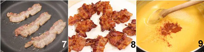 Heat a non-stick pan and when it is well hot, place the slices of bacon on it 7 and brown them on both sides, then drain them from excess fat and fold them over themselves to form a V, then place them on a plate 8. Pour the soup into 4 deep dishes (not too large), preferably 4 small bowls, sprinkle with a few pinches of paprika 9, place the slice of bacon in the center, finish with a drizzle of extra virgin olive oil and then serve with some croutons or slices of toasted bread.