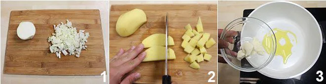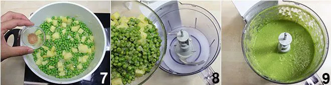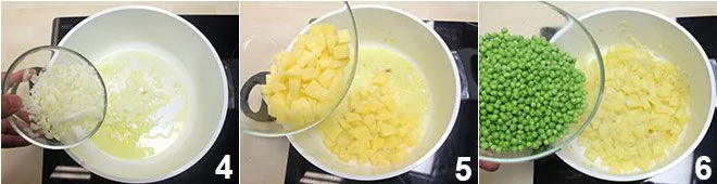 add the onion to let it soften 4. When the onion is well stewed, add the diced potatoes 5 and let them brown for 5 minutes. At this point, add the peas 6, stir, and cover the vegetables with vegetable broth or water.