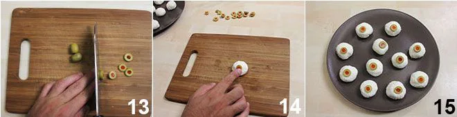 Cut the stuffed olives into thin slices 13 and gently place them on the cheese balls 12: the olives will be the pupils of your eyeballs. Once the little eyes are ready 15, place them gently on the pea velouté, which you have poured into individual bowls. What do you think, does your pea velouté look terrifying?