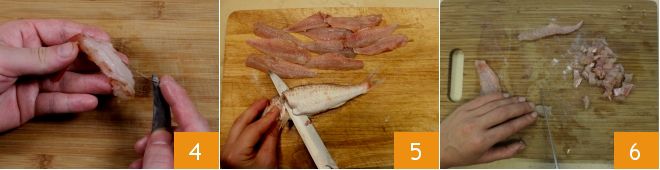 Remove the intestines from the shrimp with tweezers 4, the central black vein. Then clean the scampi as well, detaching the head and cutting the shell with scissors to extract the meat; also remove the intestines and chop both the shrimp and scampi. Finally, take the already cleaned red mullets (alternatively open them to remove the innards), cut along the top near the head with a knife and fillet them 5, being careful to remove the bones with tweezers. Then finely chop the obtained fillets 6.