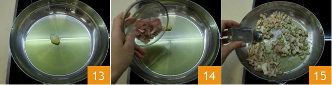While the venere rice is cooking, pour plenty of oil into another pan and brown a clove of garlic 13. Then add the previously chopped seafood 14, salt, and pepper to taste 15 and let it cook for 2 minutes.