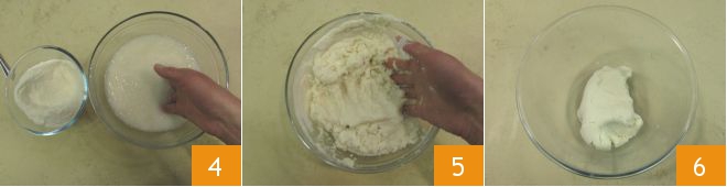 Add the flour little by little while mixing the mixture with your fingers 4. Mix all the ingredients well 5 until you get a soft but compact and not sticky mixture 6. Let it rest in the bowl for 3 minutes to allow the flour to evenly absorb the water.