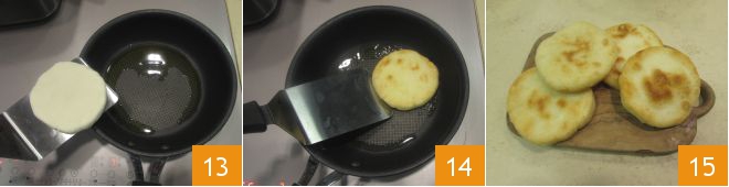then shape them on the work surface to obtain a regular shape 10. After forming the discs 11, heat the oil in a pan 12