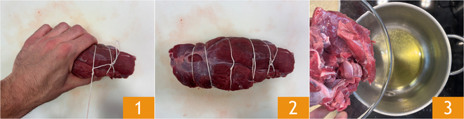 To prepare the venison roast, first clean the meat by removing the fat and sinews: you should obtain a compact and regular fillet for even cooking. Proceed with the How to tie a roast: once you make the first knot, create loops 1 and continue to the end of the meat, finishing with a knot 2, and set aside. Use the trimmings to prepare the sauce: heat a drizzle of oil in a pot and add the meat trimmings 3.