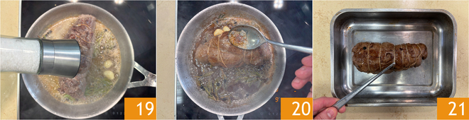 Once the bottom side is sealed, turn the roast and salt the other side 19. At this point, baste the roast 20, continuously drenching it with melted butter until well browned. Transfer the roast to a baking dish 21 and cook in a static oven at 175°F for 10-15 minutes. The internal temperature of the meat should reach 118°F at the core.