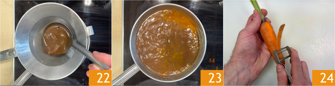 Meanwhile, strain the sauce through a sieve into a saucepan 22 and let it reduce further 23 over medium heat for 10-15 minutes. For the side dish, remove the excess green part from the carrots but leave about 1 inch of the stalk, then peel them 34.
