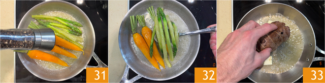 Place the vegetables in the pan and season with salt and pepper 31. Cook over high heat for a couple of minutes, then remove the asparagus from the pan 32 and continue to brown the carrots for another 2 minutes. Set aside. At this point, sear the roast in the pan again: melt 2 oz of butter and add the roast 33. Sear over high heat for one minute on each side.