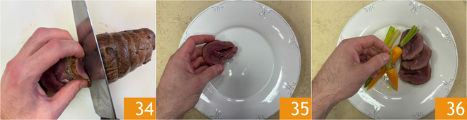 Everything is ready for plating: cut the meat into slices 34, arrange them on the plate 35, and add the vegetables 36.