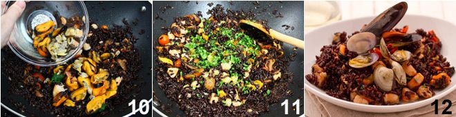 Stir, add 2/3 tablespoons of the shellfish cooking water to give flavor, and add the mussels and clams 10, chopped parsley 11, and pepper. Mix the ingredients and plate, decorating each plate with a whole mussel, some clams with shell, and a whole shrimp tail 12.