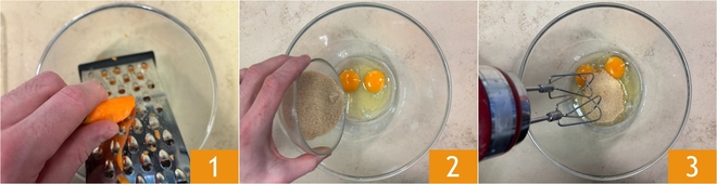 To prepare the very soft carrot cake, first peel and grate the carrots using a coarse grater 1. In a bowl, place the eggs and brown sugar 2, then beat with an electric mixer 3.