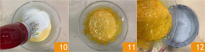 Incorporate the powders with the mixer 10 until you obtain a homogeneous mixture 11. Pour the batter into a 9-inch round pan lined with parchment paper 12.
