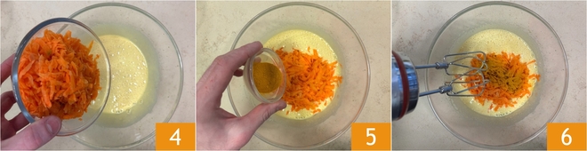 When you have obtained a light and frothy mixture, add the grated carrots 4 and turmeric 5, then mix again with the mixer 6.