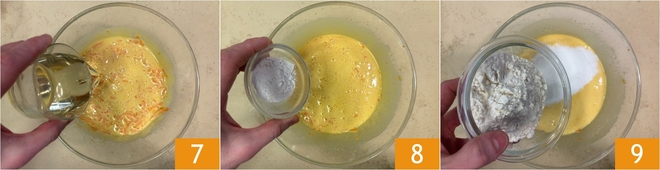 Pour in the vegetable oil 7 and mix. At this point, add the baking powder 8, corn starch, and flour that you have previously sifted 9.