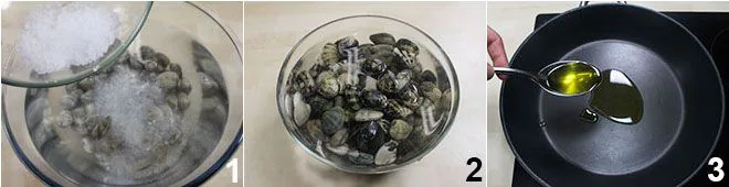 To prepare fisherman's style clams, wash the veraci clams, discarding those with broken shells and place them in a bowl of water with a handful of coarse salt 1 to purge them. Rub the clams against each other with your hands so that they release as much sand as possible and leave them to soak for 1-2 hours. During this time, change the water and coarse salt and repeat the process until the water in the bowl is completely clear and clean 2. To shorten the time, you can also rinse the clams under running water and tap them on a wooden cutting board with the opening facing down: if the clam is clean, it can be cooked; if sand is released, the clam should be discarded. Place 4 tablespoons of extra virgin olive oil in a pan 3