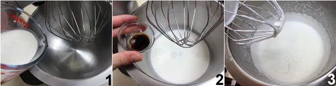 To prepare the waffle sandwiches with Nutella, place the cream in a stand mixer 2, or in a bowl, and add the vanilla extract 2. Semi-whip the cream with the whisk attachment of the stand mixer 3, or with a hand mixer. The cream should reach a soft consistency.