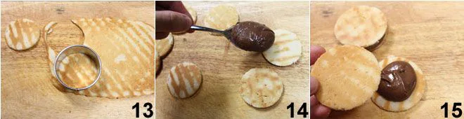 Remove the cooked batter, transfer it to a cutting board and while still warm (to avoid it hardening too much and breaking), cut out discs from the rectangle using a cookie cutter and set them aside 13. Finish all the batter this way and finally assemble the waffles. Spread a teaspoon of Nutella on one disc 14 and place another disc on top 15. Your waffle sandwiches with Nutella are ready!