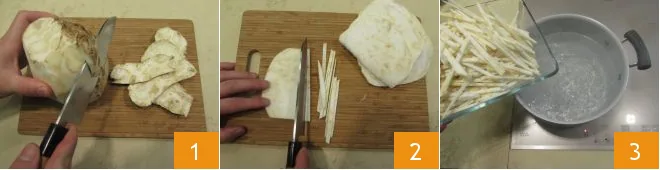 To make the Waldorf Salad, start by cleaning the celeriac. First, peel the celeriac 1, wash it well, and cut it into julienne strips 2. Then blanch it in plenty of boiling salted water 3,