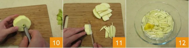 Once the dressing is ready, peel the apple, remove the core with the appropriate tool 10, and then also cut it into julienne strips 11; place the chopped apple in a bowl and to prevent it from turning brown, add half a lemon, squeezing the juice and leaving it in the water 12.