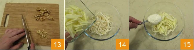 At this point, coarsely chop the walnuts 13 and start assembling your salad. In a large bowl, pour in the apples and celeriac 14, then add the freshly prepared sauce 15.
