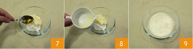 At this point, set it aside, and in the meantime, start preparing the dressing for the Waldorf Salad. In a large bowl, mix Greek yogurt with mayonnaise, then add honey 7, lemon juice 8, salt, and white pepper, and blend everything with a whisk 9.