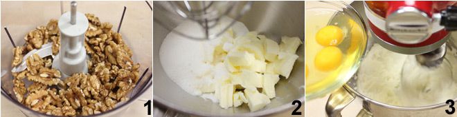 To prepare the walnut cake, start by chopping the walnuts with 1/4 cup of sugar until fine 1. Beat the butter at room temperature with the remaining sugar 2 until you get a light and fluffy mixture. Add the eggs one at a time, continuing to beat 3 until the mixture is homogeneous, then add the vanilla extract.