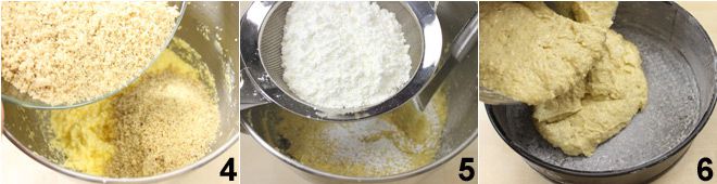 Add the chopped walnuts together with the sugar 4 and then the cornstarch that you will sift together with the baking powder 5; once you have mixed everything with a spoon, pour the mixture into a 9.5-inch greased cake pan coated with cornstarch 6. Bake everything in a preheated static oven at 355°F for 50-60 minutes, then check the cooking by pricking the cake with a skewer; if it comes out dry, the cake is ready to be taken out of the oven. Once warm, remove it from the mold and let it cool completely on a wire rack. Serve the walnut cake by dusting the surface with powdered sugar.