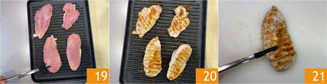 Place the chicken breasts on a well-heated grill and cook on both sides for a total of 10-15 minutes (the time may vary depending on the thickness of the meat) 19 20. Once cooked, keep the chicken aside for the moment 21.