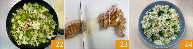 After the 20 minutes of cooking the broccolis, remove the lid and discard the garlic cloves, then raise the heat and sauté them briefly to make them golden; it's preferable not to stir but to just move the pan 22. At this point, cut the chicken breast into slices and add it to the rice, which you have mixed with the broccolis 23. Your warm salad with three broccolis is ready to be enjoyed 34!