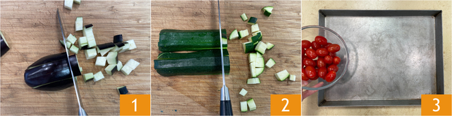 Add the eggplants and zucchinis as well 4, season with oil 5, salt, pepper, and fresh oregano 6, bake in a static oven at 450°F for 20 minutes.