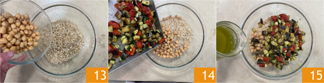 Pour the drained chickpeas into the rice 13, also incorporate the vegetables 14, and season with the flavored oil 15.