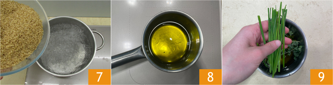 Meanwhile, boil the whole grain rice in salted water for the time indicated on the package 7. In the meantime, prepare the flavored oil by placing the oil in a small saucepan 8 with the fresh herbs you have at home 9 (rosemary, chives, fennel, oregano, marjoram, basil, parsley, or thyme).