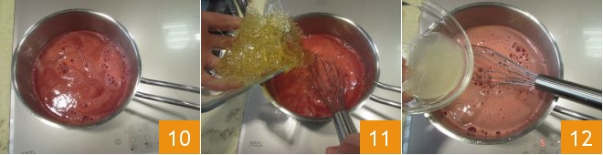 Then pour the liquids into a high-sided saucepan and heat over low heat 10. Add the soaked and well-squeezed gelatin 11 and the lemon juice 12.