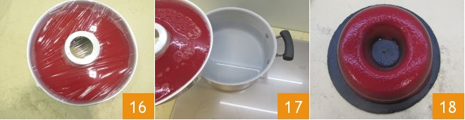 Cover it with clear plastic wrap 16 and place it in the refrigerator to set for at least 12 hours. After this time, fill a saucepan halfway with water. It is important that the saucepan has a slightly larger circumference than the ring-shaped mold in which you poured the mixture. Bring the water to a boil and place the mold with the preparation on top of it 17 so that the heat allows the dessert to detach from the mold. It will only take a few seconds. Then remove the mold from the saucepan with spatulas, place a serving plate over the mold, and flip both together onto a flat surface. Then detach the mold and serve your watermelon ring with Moscato 18! If you wish, you can serve it accompanied by some pieces of watermelon or berries.