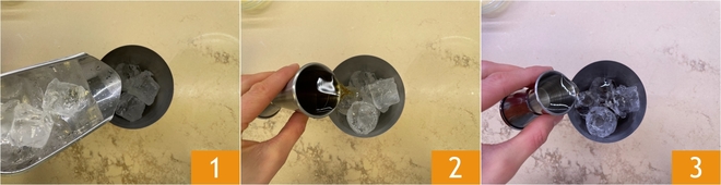 To prepare the whiskey sour, first pour the ice into the shaker 1 along with the bourbon whiskey 2 and the sugar syrup 3.