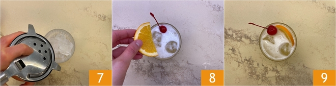 Strain the cocktail through the strainer 7 and fill the glasses to the brim, then garnish with an orange slice 8 and a maraschino cherry 9. Your whiskey sour is ready to be enjoyed!