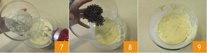 Resume using the electric mixer and gradually incorporate the flour while keeping the mixer running 7, then add the dark chocolate chips 8 and mix again with the spatula to blend 9.
