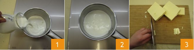 To prepare the white chocolate ganache, pour the cream into a saucepan 1 and bring it just to a boil 2. Meanwhile, finely chop the chocolate 3 and place it in a large bowl.