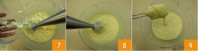 Then add the soft butter in cubes, a little at a time 7, stirring with a spatula to melt it; you can also blend with an immersion blender for a smoother texture 8. At this point, use your white chocolate ganache as desired 9.