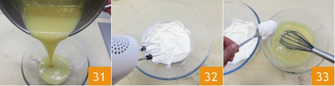 Stir with a whisk until the chocolate is completely melted and put the mixture in a bowl 31. Let it cool, stirring occasionally, and place it in the refrigerator for about 30 minutes. When it's cold, whip the remaining cream 32 and add it to the cream and chocolate mixture, adding a tablespoon at a time 33 and stirring with a whisk.