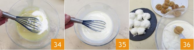 Gently mix with a whisk 34 until you obtain a soft cream 35. Take your cream puffs and, using a spoon, dip them into the cream and chocolate mixture 36.