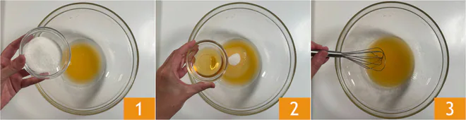 To prepare the white sangria, first pour the orange juice into a large bowl. Add the sugar 1, orange liqueur 2, and stir until all the sugar has dissolved 3.